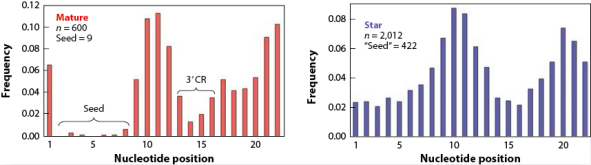 miRNA前体在Dicer酶的作用下产生双链RNA,一条指导链和一条随从链。当两条链的表达水平相差2倍以上时,更高的成为mature miRNAs,而另一条则为star miRNAs;如若两条链表达水平相当,则两条链均称为mature miRNAs[1]。再者,Star miRNAs发挥更为微弱的生物学功能。进化分析发现,star miRNAs拥有比mature miRNAs更高的碱基替代率,这种现象在seed区域显得更为明显(>46倍的差异)(图4)。