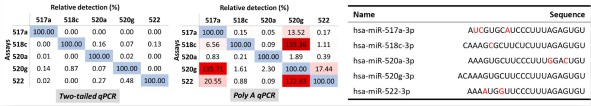 图5. 利用Two-tailed qPCR技术及Poly-A qPCR技术分别对人工合成的miR-515家族miRNAs进行交叉检测。