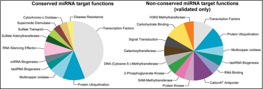 图3. 保守miRNAs(左)及非保守miRNAs(右)的靶基因功能统计分析。保守miRNAs主要调控转录因子的基因表达,而非保守miRNAs的靶基因功能则相对弥散。