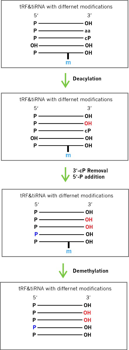 tRF&tiRNA是一类由tRNA发生精确切割而产生的非编码小RNA分子,近来研究表明,这类小RNA分子具有多种生物学功能,比如类似于microRNA参与RNA干扰;调节靶向mRNA的稳定性;在细胞应激条件下促进应激颗粒(SG)的组装;以及调控细胞凋亡等。此外,tRFs&tiRNAs还与癌症、神经退行性疾病等多种疾病紧密关联。 然而,tRFs&tiRNAs 的分子特性对其精确的表达定量造成了挑战。 由于其独特的前体与切割方式,tRFs&tiRNAs携带有多种内部或末端修饰。tRF和tiRNA可能保留了来源的tRNA上的甲基化修饰(m1A、m1G和m3C等)和氨酰基末端,tiRNAs常由RNA内切酶Angiogenin切割产生,这类内切酶会在切割位点产生5‘羟基(5’-OH)末端与3’环磷酸(3‘-cP)末端。许多当前标准的cDNA文库构建方法,特别是针对小非编码RNA的方法,包含了将3’和5’寡核苷酸接头连接到RNA的3’和5’末端的接头连接步骤,需要底物小RNA 5’端为磷酸,3‘端为羟基。此外,tRFs&tiRNAs的内部修饰比如m1A, m1G与m3C会严重阻碍反转录过程。为了准确检测tRFs&tiRNAs,这些修饰必须被有效的去除。