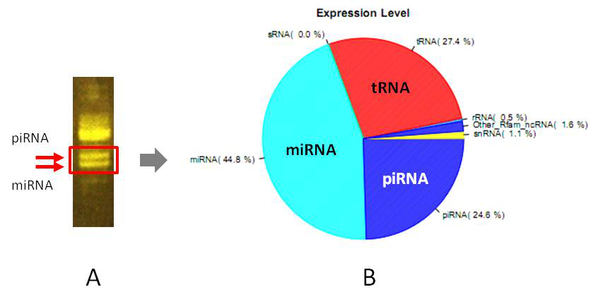图释:A :piRNA和miRNA在PAGE凝胶上的片段分布区域十分接近。B:同时对这两片段区域的RNA进行测序,很容易发生piRNA和miRNA的reads彼此重叠,这对二者尤其是piRNA的测序结果造成严重干扰。此外,其他小RNA分子的reads数不足2%,不足以进行分析。
