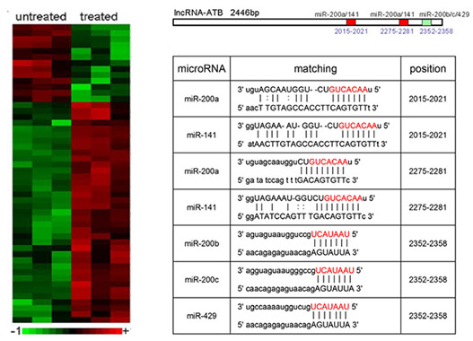 ceRNA分析:lncRNA-ATB含有多个miR-200s结合位点(右图)。