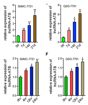 作者顺利获得大量肝癌组织样本研究lncRNA-ATB与肝癌的临床关系。lncRNA-ATB在肝癌组织中的表达水平高于癌旁组织,并且lncRNA-ATB在转移性肿瘤组织中的表达水平显著高于原发性肿瘤组织。K-M曲线显示,lncRNA-ATB高表达的肝癌患者预后较差,可以作为潜在的预后生物标记物。