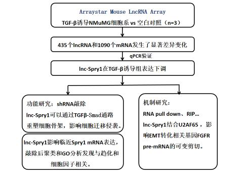 顺利获得研究lnc-Spry1和临近基因Spry1的表达,发现两者具有表达相关性,敲除lnc-Spry1后进行高通量检测和GO分析,发现趋化因子和细胞因子相关基因发生显著变化。进一步进行lnc-Spry1的机制研究,顺利获得RIP和RNA pull down技术,发现lnc-Spry1可以结合可变剪切相关蛋白U2AF65,从而影响EMT转化相关基因FGFR pre-mRNA的可变剪切过程。