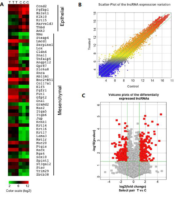 图一、A:TGF-β处理后芯片检测中显著变化的EMT相关基因;B:TGF-β处理后芯片检测差异变化显著的lncRNA分布散点图;C:TGF-β处理后芯片检测FC>2,P<0.05的lncRNA分布火山图;