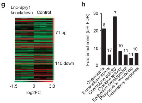 图二、g. Lnc-spry1敲除后影响基因表达的聚类图;h. Lnc-spry1敲除后进行GO分析,发现富集的GO条目与趋化因子、细胞因子相关。