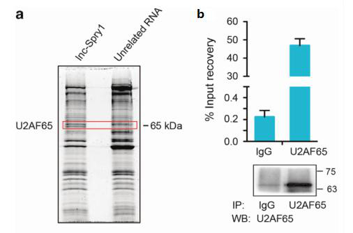 图三、a. RNA pull down联合质谱实验 Lnc-spry1可结合U2AF65;b. RIP实验 U2AF65可以结合Lnc-spry1。