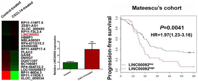 为了探究CXCL14异常表达促进卵巢癌的发生中lncRNAs的表达水平是否发生变化,作者构建了CXCL14突变的细胞模型,并且借助美国Arraystar Human lncRNA array检测了CXCL14突变株和野生型细胞中lncRNAs的表达情况。根据芯片结果,作者选取了上调最显著的5个lncRNA分子(RP11-119F7.5, ZEB1-AS1, XLOC_000493, RP11-12L2.4, and LINC00092)进行功能验证(Loss of Function),发现只有LINC00092的表达水平发生变化会影响卵巢癌细胞的迁移能力。因此,作者就将LINC00092作为CXCL14调控癌细胞发生和开展的下游靶基因做了进一步探究。