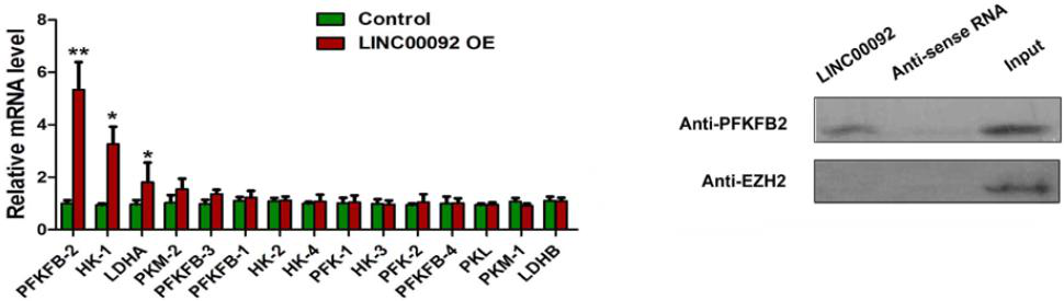 糖酵解过程在肿瘤发生和癌症开展中起到重要的作用,并且已有多篇文献报道lncRNA可以顺利获得多种机制来调控糖酵解,因此作者探究LINC00092是否也是顺利获得调控糖酵解过程来促进卵巢癌的发生。实验发现敲除LINC00092会使得癌细胞内很多代谢产物的含量明显降低,尤其是乳酸的含量变化最为明显。上述实验表明LINC00092可以改变卵巢癌细胞代谢过程中的糖酵解水平。然后,作者开始研究LINC00092在改变糖酵解过程中是如何发挥功能的。借助RT-PCR和RNA pull down实验,作者找到了LINC00092的靶基因果糖-2,6-二磷酸酶2(PFKFB2),并且进一步分析发现LINC00092和PFKFB2的表达水平呈正相关(r=0.52)。上述一系列实验也表明了LINC00092是顺利获得结合PFKFB2来调控卵巢癌的发生和开展的。