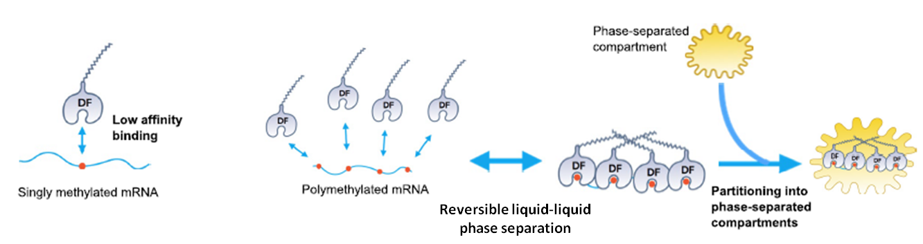 图5. 多聚m6A区域以高亲和力与阅读蛋白YTH-DF1, 2, 3结合,根据代谢目的被分隔进不同的亚细胞区域。单独m6A的低结合亲和性使其不能介导此类功能[13]。