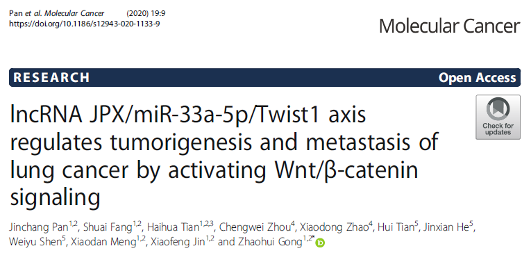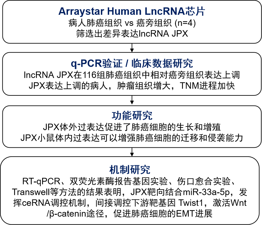 宁波大学医学院龚朝辉教授团队主要从事肿瘤分子生物学研究。今年,该研究团队应用Arraystar lncRNA芯片筛选发现了一个在肺癌中异常上调的lncRNA——JPX,该lncRNA分子顺利获得与miR-33a-5p结合而充当Twist1的ceRNA,影响肿瘤的大小、TNM分期和肺癌的转移。进一步深入研究表明,JPX是顺利获得调节miR-33a-5p/Twist1,参与了Wnt/β-catenin信号的激活,进而促进了EMT过程,最终影响了肺癌的发生开展。该研究提示JPX/miR-33a-5p/Twist1轴可能具有治疗肺癌的潜力,具有作为药物作用靶点的潜力。该研究成果发表在Molecular Cancer上(IF:15.302)上。(芯片实验由hjc黄金城生物丨数谱生物给予技术服务)