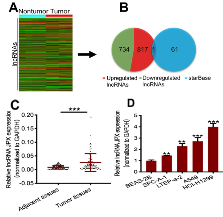 D. RT-qPCR分析四种肺癌细胞系(SPC-A-1,LTEP-a-2,A549,NCI-H1299)相对正常肺上皮细胞系(BEAS-2B)中JPX相对表达量上调