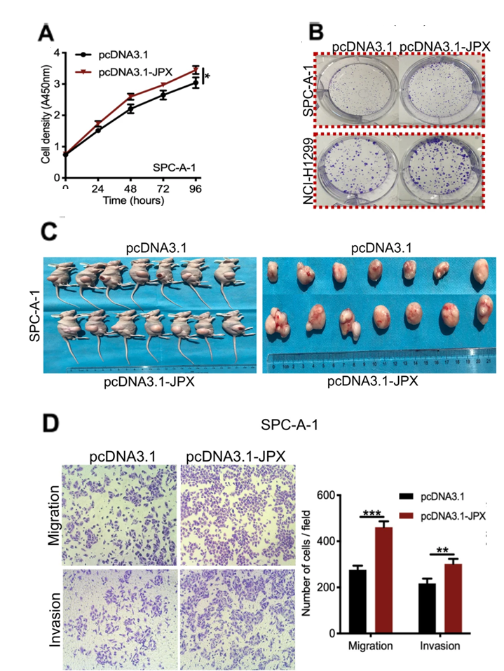 图2. JPX体外过表达促进肺癌细胞的生长和增殖,增强肺癌细胞的迁移和侵袭能力