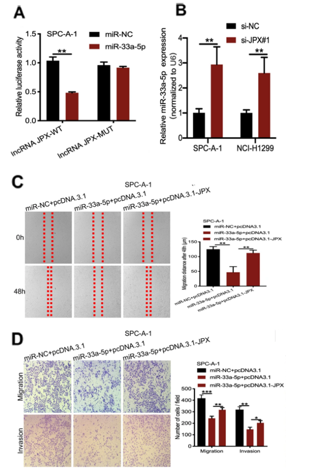 图3. JPX发挥ceRNA调控机制,在肺癌细胞中作为海绵,靶向结合miR-33a-5p