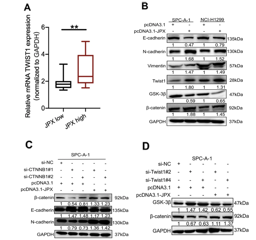 D. 蛋白免疫印迹检测si-Twist1+pcDNA3.1-JPX转染后的SPC-A-1细胞中GSK-3β和β-catenin的表达量。