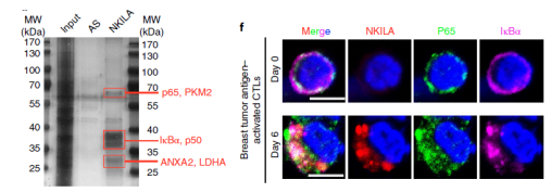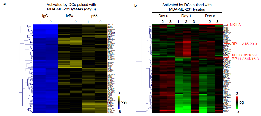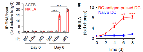 为了研究lncRNA在NF-κB调控AICD的过程中的关联性,作者利用Arraystar Human LncRNA 芯片对肿瘤细胞裂解物致敏的DC细胞共培养6天后激活的乳腺癌浸润T细胞样本分别做了IκBα和NF-κB组分P65抗体的RIP-Chip,鉴定到96个两种蛋白共同结合的lncRNA,作者同时利用Arraystar Human LncRNA芯片对未激活与6天后培养激活的T细胞进行差异表达lncRNA筛选,发现96个结合的lncRNA中有4个(XLOC_011899, RP11-854K16.3, RP11-315I20.3和NKILA)也发生了显著表达上调,作者利用qRT-PCR进行的lncRNA表达验证,RIP-qPCR进行了IκBα和P65结合lncRNA验证,与前期筛选趋势相符。