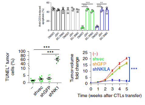 随后,作者对NKILA进行了in vitro细胞水平的功能研究,用PHA培养激活T细胞扩增,再用anti-CD3诱导凋亡,NKILA shRNA干扰后凋亡被抑制,且IκBa磷酸化水平升高,NF-κB上调;利用NF-κB inhibitor JSH/sc-3060处理NKILA shRNA干扰后的T细胞,凋亡增加;NKILA shRNA也能抑制抗肿瘤特异性的CTLs被anti-CD3诱导的AICD过程。In vivo小鼠实验证明,利用乳腺癌病人来源的癌细胞构建移植瘤模型,NKILA敲除可以抑制T细胞的AICD过程并提高过继性细胞疗法的效果;CTLs进行NKILA敲除可以促进肿瘤细胞凋亡并且抑制肿瘤体积增长。
