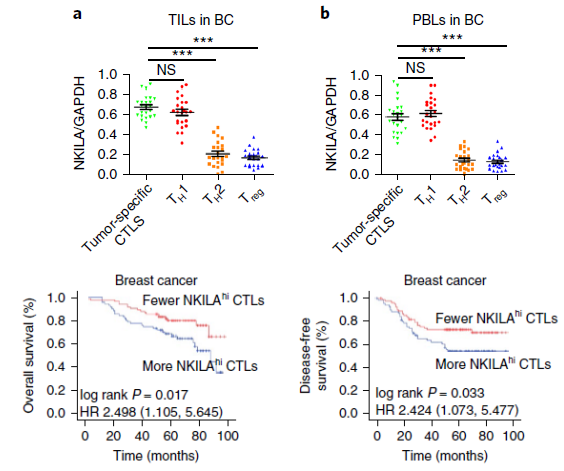 最后,作者进行了临床应用研究,在24个乳腺癌病人来源的外周血和肿瘤组织中分离不同T细胞亚群,发现NKILA在肿瘤特异性CTLs和Th1细胞中表达显著高于Th2和Treg细胞;对206个乳腺癌病人进行生存分析发现,NKILA高表达的肿瘤特异性CTLs含量高的病人预后生存期降低,说明NKILA与临床预后有相关性。