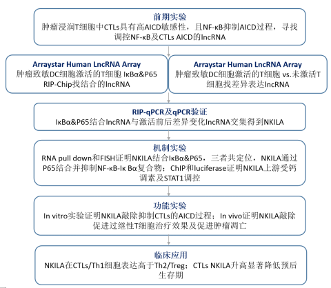 在这项研究中,研究人员顺利获得Arraystar Human LncRNA芯片筛选了抗肿瘤特异性CTLs中结合NF-κB并在激活过程差异表达的lncRNA NKILA,顺利获得功能机制实验验证肿瘤特异性CTLs中NKILA可以顺利获得结合NF-κB从而影响CTLs的AICD过程及影响肿瘤的免疫逃逸,NKILA上游受到TCR激活的钙离子流影响,进而影响钙调素及STAT1与NKILA启动子的结合及NKILA的转录。