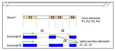 基因1的初始转录本顺利获得剪接加工了形成两个成熟的转录本:A和B。第一时间,转录本序列被分为4个外显子原件(F1, F2, F3和F4)和3个剪接位点元件(J1, J2和J3)。接下来,为每个元件设计一个探针。最后,挑选转录本A的特异性探针(J2)和转录本B的特异性探针(F3, J3)。F1、F2和F4可以同时检测这两个转录本,因此被用作基因特异性探针,检测基因1的整体表达水平。