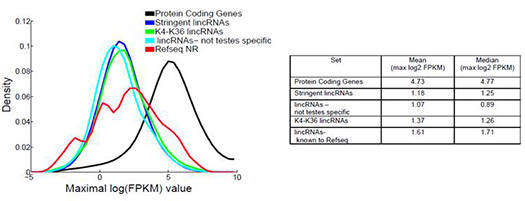 图1. RNA在所有组织中的最高表达水平分布曲线。log2FPKMs值经由Cufflinks评估,蓝线表示严谨型lincRNAs,绿线表示含有K4-K36结构特征的严谨型lincRNAs,浅蓝色线表示非睾丸特异性的严谨型lincRNAs,红线表示RefSeq NR中已知lincRNAs,黑线表示蛋白编码基因。右表为最高表达水平的平均值和中值[4]。蛋白编码基因与lncRNAs的表达差异倍数表示为2log2(FPKM)。