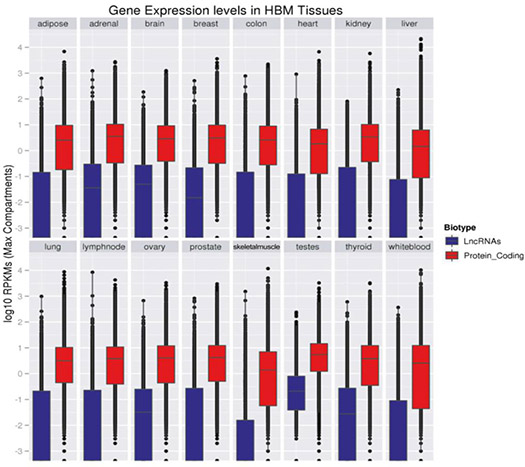 图2. LncRNAs(蓝色)和蛋白编码转录本(红色)在人体组织中的表达分布[7]。纵轴上的表达水平以log10RPKM表示。