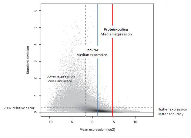 图3.标准偏差与表达水平的关系。Y轴为三次技术重复的标准偏差,每个灰色点代表一个转录本。在阴影区,灰度代表密度,灰度越深,密度越大。如图中所示,转录本平均表达水平越低,标准偏差越高;表达水平越高,标准偏差越低,定量越可靠,相对误差低于20%。在RNA-Seq中,只有41%的转录本能够被准确定量(水平虚线以下);而对于高表达的转录本(垂直虚线右侧),其中高达84%的转录本的定量是可靠的。这可以从垂直虚线右侧而不是左侧的高密度区落在了水平虚线以下看出[9]