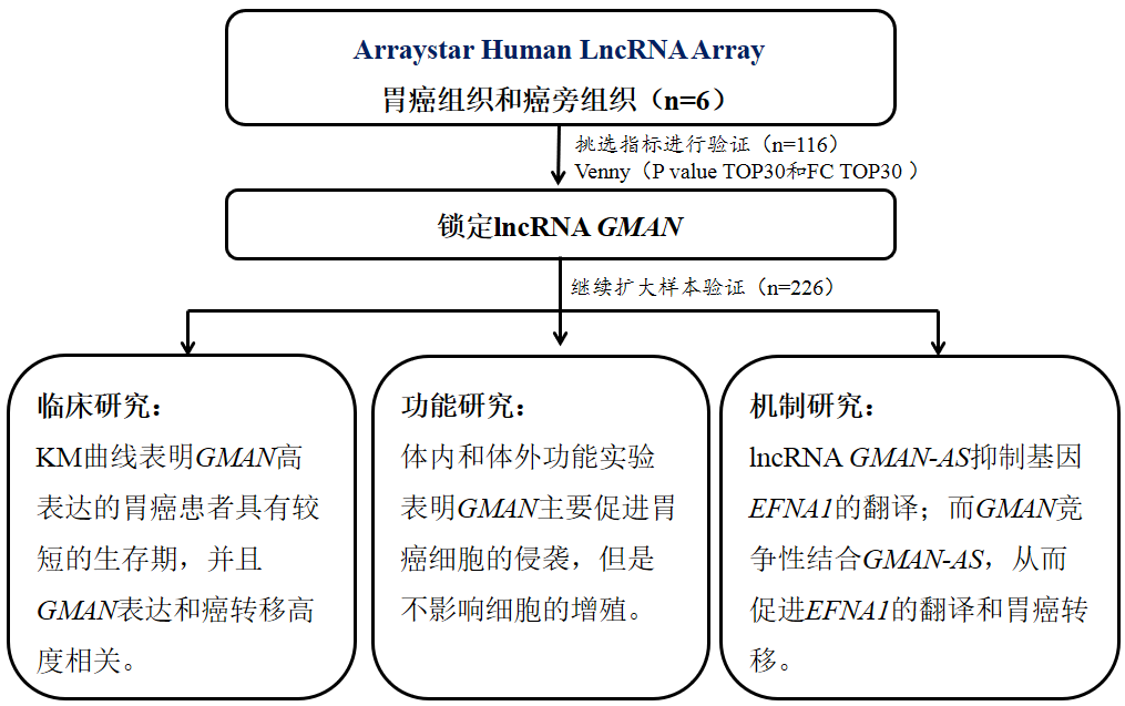 该课题组借助Arraystar Human lncRNA 芯片筛选胃癌组织中异常表达的lncRNA。并经过进一步扩大样本验证和临床相关性分析发现lncRNA GMAN高表达的胃癌患者通常具有较短的生存期。体内和体外功能实验显示lncRNA GMAN主要是促进胃癌细胞的侵袭,而深入的机制实验证实GMAN是顺利获得促进基因EFNA1的翻译进而调控胃癌的转移。该研究揭示了lncRNA调控基因表达的新模式,也为研究胃癌的癌转移和治疗给予了新的线索。