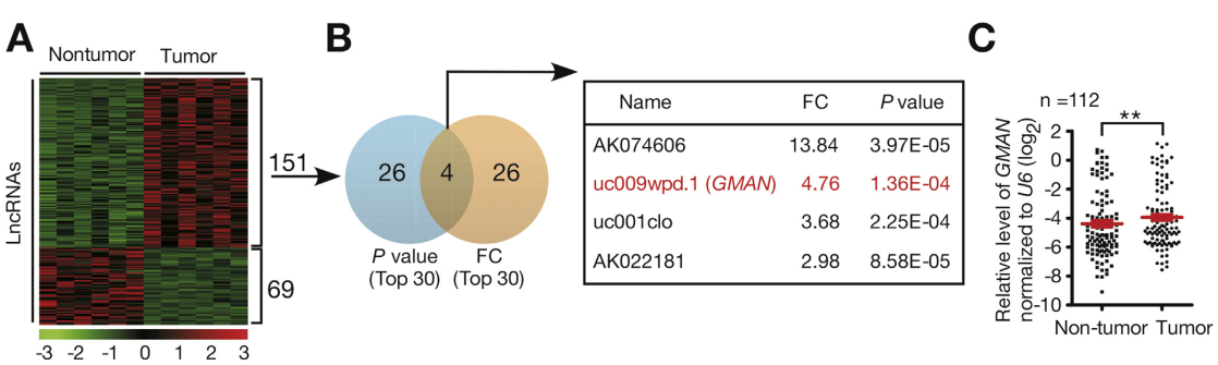 作者第一时间选取了6个胃癌患者的癌组织和癌旁组织,顺利获得Arraystar lncRNA芯片筛选差异表达的lncRNA。总共筛选到151个上调和69个下调的lncRNAs。接着,根据上调的151个指标的韦恩分析结果挑选了4个lncRNAs继续扩大样本验证(n=112),验证结果显示lncRNA GMAN在胃癌组织中表达水平显著高于癌旁组织。然后,作者借助RACE、FISH、蛋白编码潜力预测和Northern Blot等实验对lncRNA GMAN的分子特征进行探究,发现GMAN是由基因EFNA1的intron 2和3区域转录出来的一条长度是855nt的lncRNA,并且它主要定位在细胞质中。