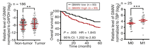 为了探究GMAN和胃癌以及癌转移的临床相关性,作者选取了两组样本(n=40和n=186)进行临床生存分析,K-M生存曲线显示GMAN高表达的患者生存期都比较短。而且与未发生癌转移患者的胃癌组织相比,癌转移患者的胃癌组织中lncRNA GMAN的表达水平显著上调。并且,TCGA数据库的大样本分析结果也证实了这个结果。