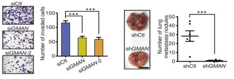 接下来,作者选取了胃癌细胞系BGC-823和HGC-27做GMAN的功能实验,过表达和干扰实验表明GMAN主要促进胃癌细胞的侵袭,但是不影响胃癌细胞的增殖。此外,体内实验也证实了GMAN可以促进癌细胞的肺转移。