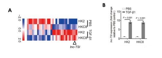图一、A. 聚类图展示TGF-β处理后芯片检测中显著变化的lncRNA;B. qPCR验证lnc-TSI在TGF-β处理组显著上调。