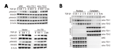 图二、A. Lnc-TSI抑制SMAD3 磷酸化水平;B. Lnc-TSI敲低显著促进SMAD3转运入核。