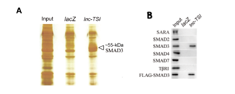 图三、A. RNA pull down检测Lnc-TSI可结合SMAD3;B. RIP实验验证SMAD3与Lnc-TSI结合