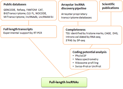 Arraystar拥有高质量的转录组和lncRNA数据库,对各种来源的lncRNA进行了全面收集,包括所有权威数据库、高水平文章以及顺利获得自有收集流程所得到的lncRNA。在芯片lncRNA收录过程中,对全长lncRNA给予了特别关注。比如,优先选择公共数据库中注释为全长或有实验数据支持的lncRNA。顺利获得强有力的已知数据,对Arraystar转录组数据库以及新近研究进展中的lncRNA进行了严谨的序列完整性评估,包含是否有组蛋白标记,CAGE簇和DNA酶I超敏位点(DHS)等数据支持的5’末端,poly(A)位点测序(3P-Seq)数据支持的3’末端。另外,Arraystar还使用多种方法对lncRNA的编码潜能进行了评估,只有顺利获得以上评估的lncRNA才会被标记为全长lncRNA,并被收录进芯片(图1)