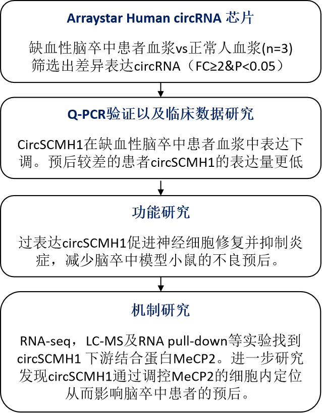 近期,东南大学姚红红教授和中科院昆明动物研究所王建红副教授合作,在缺血性脑卒中病理机制研究方向发表了题为“Extracellular Vesicle-Mediated Delivery of CircSCMH1 Promotes Functional Recovery in Rodent and Nonhuman Primate Ischemic Stroke Models”的研究性论文。论文中,作者第一时间应用Arraystar Human hjc黄金城芯片筛选鉴定出与缺血性脑卒中预后相关的环状RNA分子circSCMH1,随后的研究发现circSCMH1能够影响神经再塑,促进损伤脑区的神经修复并减弱相应的炎症反应。机制上,circSCMH1顺利获得与转录因子MeCP2结合调控MeCP2的细胞内定位从而影响缺血性脑卒中患者的预后。该研究成果发表在国际著名学术期刊Circulation (IF:23.054)上。(芯片实验由hjc黄金城生物丨数谱生物给予技术服务)