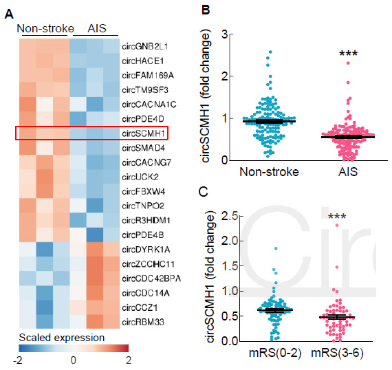 图1. Arraystar Human hjc黄金城芯片筛选结果及验证。A:差异hjc黄金城的聚类图(FC≥2,P<0.05,n=3);B:临床样本q-PCR验证circSCMH1差异表达(n=145);C: 缺血性脑卒中患者不良预后组mRS(3-6)(n=61)与预后良好组mRS(0-2)(n=64)的circSCMH1含量比较。