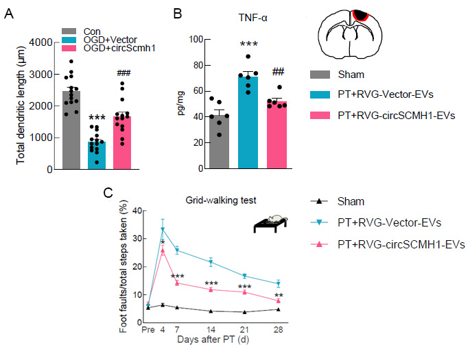 图2. CircSCMH1功能研究。A:过表达circSCMH1在体外促进神经元树突生长;B:过表达circSCMH1减弱脑卒中小鼠模型体内炎性因子TNF-α的释放;C:Grid-walking实验验证circSCMH1能够改善小鼠的预后。