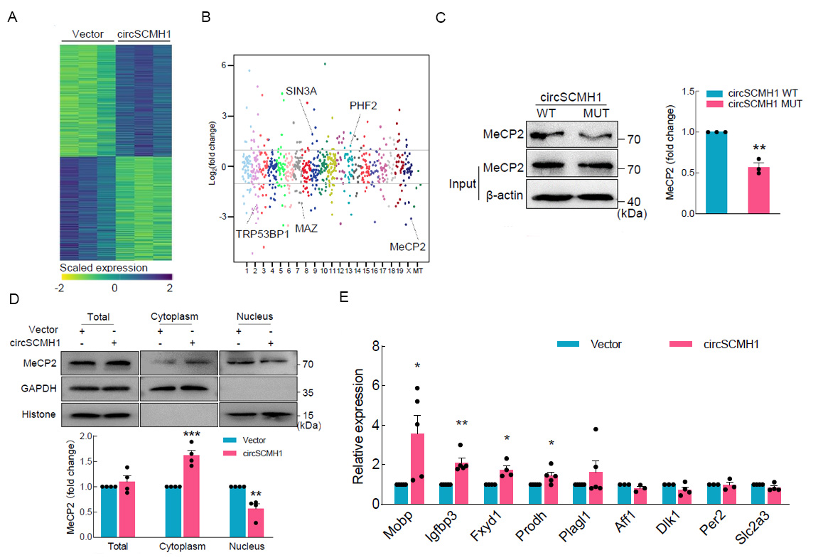 图3. CircSCMH1机制研究。A:RNA-seq分析过表达circSCMH1后细胞中差异表达基因;B:LC-MS分析过表达circSCMH1后细胞核中蛋白差异表达情况(FC>2,P<0.05);C:RNA-pull-down证明circSCMH1与MeCP2结合;D:过表达circSCMH1后MeCP2在细胞质中分布增加;E:MeCP2下游靶基因在过表达circSCMH1后表达上调。