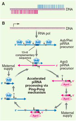 与siRNA和miRNA的产生机制不同,piRNA并不产生于dsRNA前体。它似乎来自成簇piRNA的初始转录物,随后再形成成熟的piRNA,此过程的详细机制现在尚不清楚。然而从果蝇中的研究发现,与Aub或者Piwi相互结合的piRNA的前十个核苷酸(一般首个核苷酸是尿苷),可以和与Ago3结合的piRNA的前十个核苷酸(一般在10位的是腺苷)互补。由此提出了piRNA形成的“乒乓”模型,即由于piRNA之间序列互补,因此互为引物进行扩增,产生新的piRNA[3]。