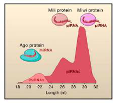 成熟的piRNA是一类长约26-32nt的单链小RNA分子。在小鼠睾丸内只存在几百种不同的miRNA,而piRNA却至少有5万种[2]。piRNA即使在近缘物种之间保守性也很差,在长度、表达类型和基因结构上则与microRNA截然不同。