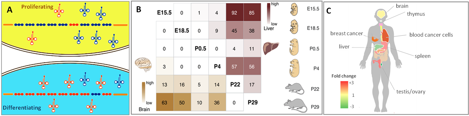图1.(A)增殖和分化状态的细胞有不同的tRNA表达谱特征[1]。(B)tRNAs具有组织、器官、发育阶段特异性表达[2]。(C) tRNAs在不同人体组织和疾病中差异表达。例如骨髓瘤细胞相比于正常骨髓细胞通常具有更高的核tRNA表达[3]。