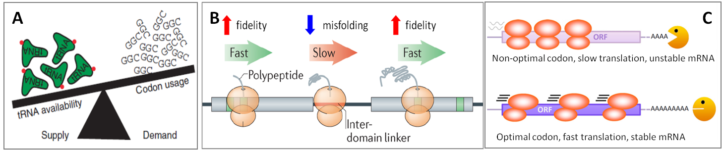 图2.(A)当同工tRNA供应量超过蛋白翻译需求量时称为最优密码子。当同工tRNA供应不足或需要使用近似同工tRNA时称为非最优密码子。(B)最优密码子加快翻译速率并提高解码精确性。非最优密码子翻译速率慢得多但有利于蛋白正确折叠,通常发生在编码的蛋白结构域之间的连接区域。(C)经过最优密码子时更快的翻译延伸速率可保护mRNA不被降解。使用非最优密码子导致翻译速率降低、核糖体停滞、暴露的mRNA更容易降解,从而缩短mRNA半衰期。