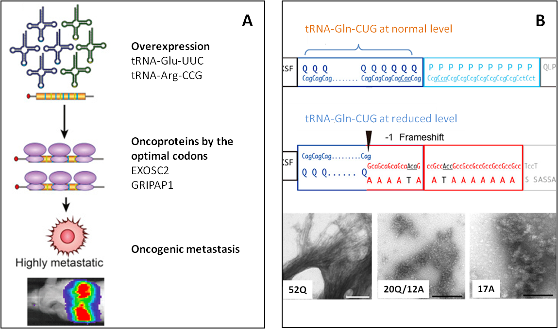 图3.(A)过表达tRNA-Glu-UUC和tRNA-Arg-CCG可上调以它们为最优密码子的原癌蛋白EXOSC2和GRIPAP1的翻译,促进原癌基因驱动的乳腺癌侵袭过程[6]。(B) 正常供应量的tRNA-Gln-CUG可以正确翻译亨廷顿蛋白中的多聚谷氨酰胺链PolyQ重复区域,tRNA-Gln-CUG含量降低则会导致移码翻译(编码Gln的密码子CAG阅读框前移一位变为编码Ala的密码子GCA)产生错误的多聚丙氨酸链PolyA。亨廷顿蛋白中Q/A的比率决定了蛋白聚集状态(52Q正常状态,20Q/12A中间态,17A致病聚集状态)从而影响亨廷顿舞蹈症的严重程度[7]。