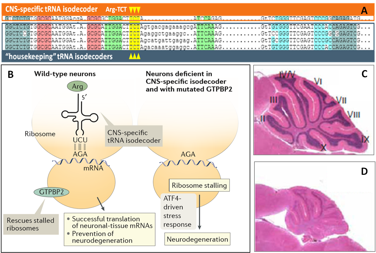 图4. (A) CNS特异性表达以及“管家”tRNA-Arg-UCU isodecoder基因序列 (B) CNS特异性表达的isodecoder对于正常神经元的翻译顺利进行至关重要,否则,该细胞将遭受神经变性。(C) 正常野生型脑。 (D) 缺失CNS特异性tRNA-Arg-UCU isodecoder 的神经变性脑 [8].