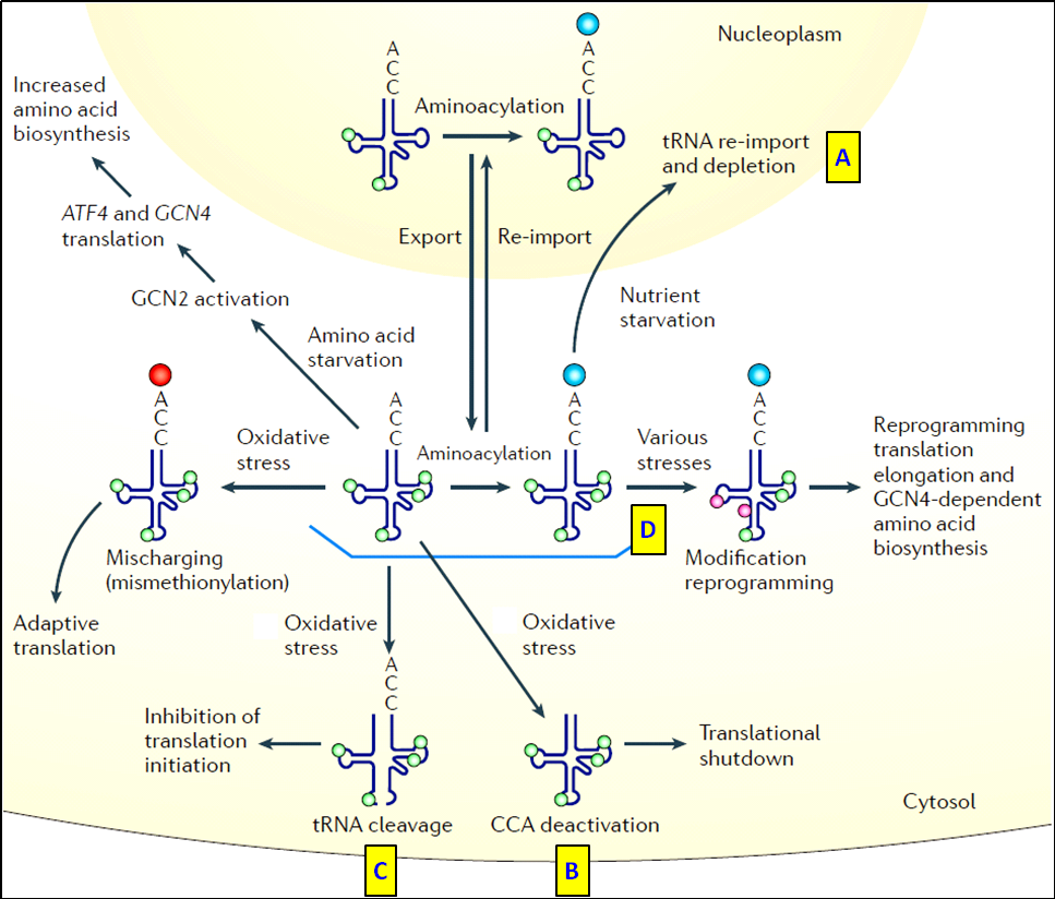 图6.响应细胞压力应激的tRNAs (A) 营养缺乏导致tRNAs从胞质重新运回胞核,使胞质中参与蛋白翻译的tRNA库耗竭; (B) tRNA 3’CCA 臂失活; (C) 缺氧诱导tRNA断裂形成tRF和tiRNA片段,抑制蛋白翻译起始。(D)在营养匮乏期间,tRNA修饰重编程促进氨基酸合成途径中蛋白质/酶的翻译[11]。
