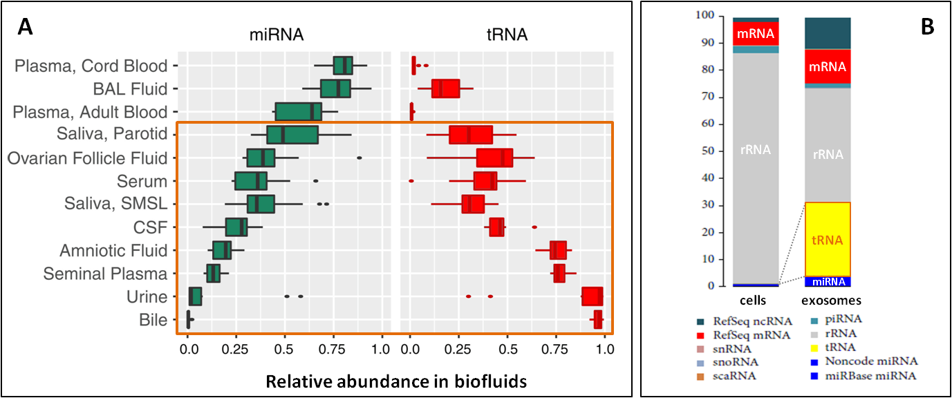 图7.(A)miRNA与tRNA在体液中相对比例的对比,在某些类型体液中tRNA含量高于miRNA [12, 13]。(B)与其他胞内RNA相比,tRNA在外泌体中高度富集,远超miRNA[14]。