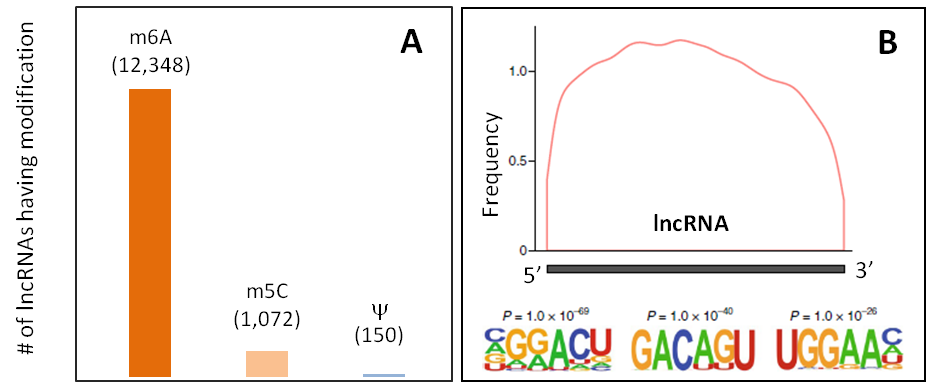 图 1. (A) 含有 m6A、 m5C 或 修饰的lncRNA 转录本数量。 (B) lncRNA m6A 修饰特征及 m6A motif。