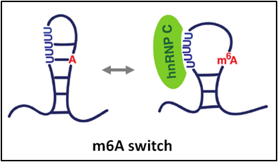 lncRNAs 的m6A 修饰 可以发挥 “m6A 转换器”功能,m6A 修饰减弱了颈环结构中的序列互补配对, 开放poly-U5 区域与hnRNP-C 结合(图 2)[3,4]。 m6A转换器机制是 YTH-domain家族以外识别蛋白的通用机制,比如 hnRNPs 识别蛋白不是直接结合m6A 修饰位点,而是与临近5个陆续在的U序列(poly-U) 结合 。 现在,已发现的m6A 转换器有39,000种。 对 lncRNA-Malat1而言, m6A 转换器影响RNA 剪切及丰度,从而调控细胞周期及肺癌的进展。