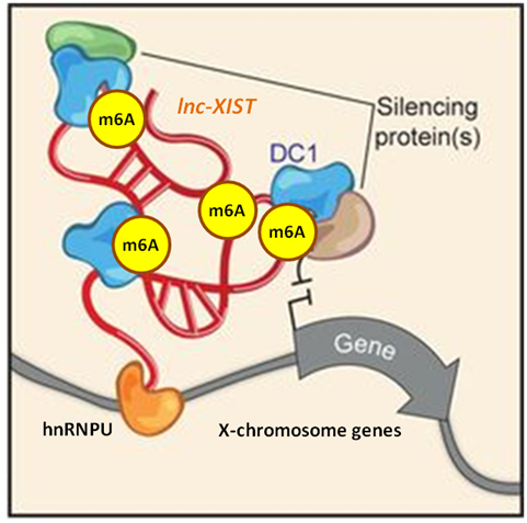 LncRNA m6A 修饰结合识别蛋白,比如YTH蛋白,可以直接影响 lncRNA 分子功能。 例如, lncRNA XIST 被 METTL3、WTAP、 RBM15/15B 甲基化酶添加上m6A修饰后,识别蛋白YTH-DC1顺利获得 招募染色质沉默复合物,使X染色体凝缩并失活。